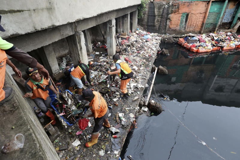 Workers collect trash during a clean-up after a flood in Jakarta on Jan 5, 2020.