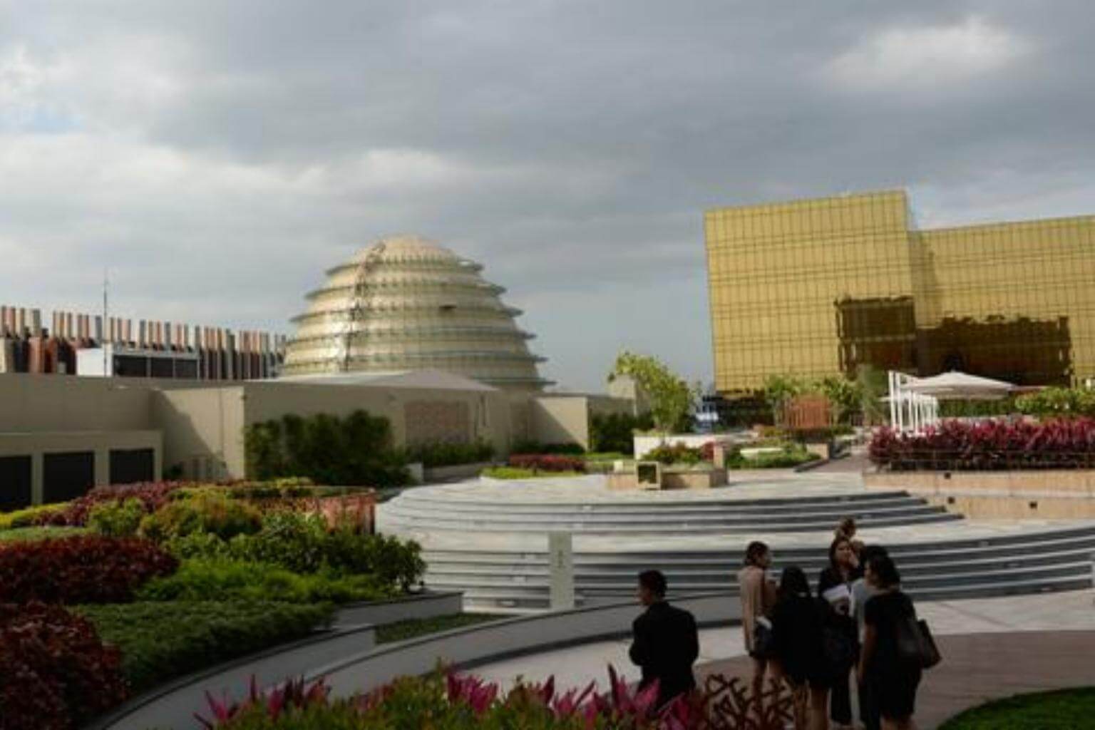 Visitors walk near the golden dome called the "Fortune Egg" of the City of Dreams mega-casino in Manila.