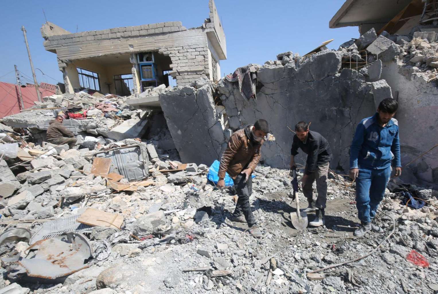 This file photo taken on March 26, 2017, shows Iraqis cleaning up the rubble of destroyed buildings in the Mosul's al-Jadida area.