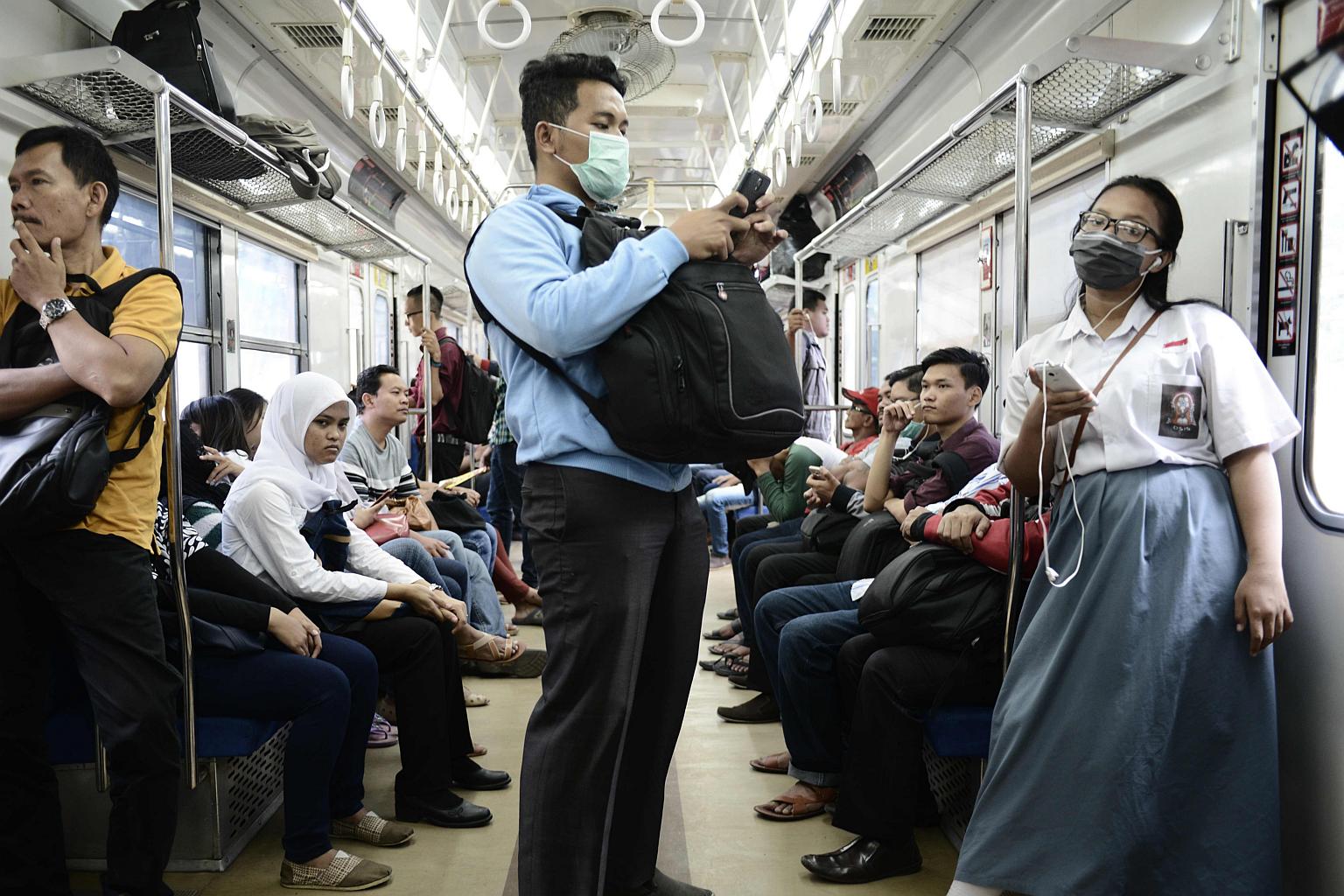 A man and a student wearing masks on a train in Jakarta. Wearing masks has become increasingly popular as residents commmute in the Indonesian capital.