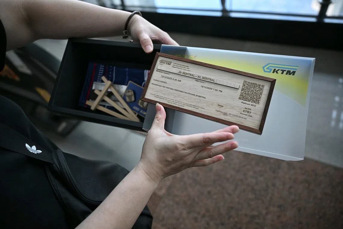 Staff of Malaysian train operator Keretapi Tanah Melayu (KTM) handed out goodie bags containing wooden replicas of the train tickets to mark the historic occasion.