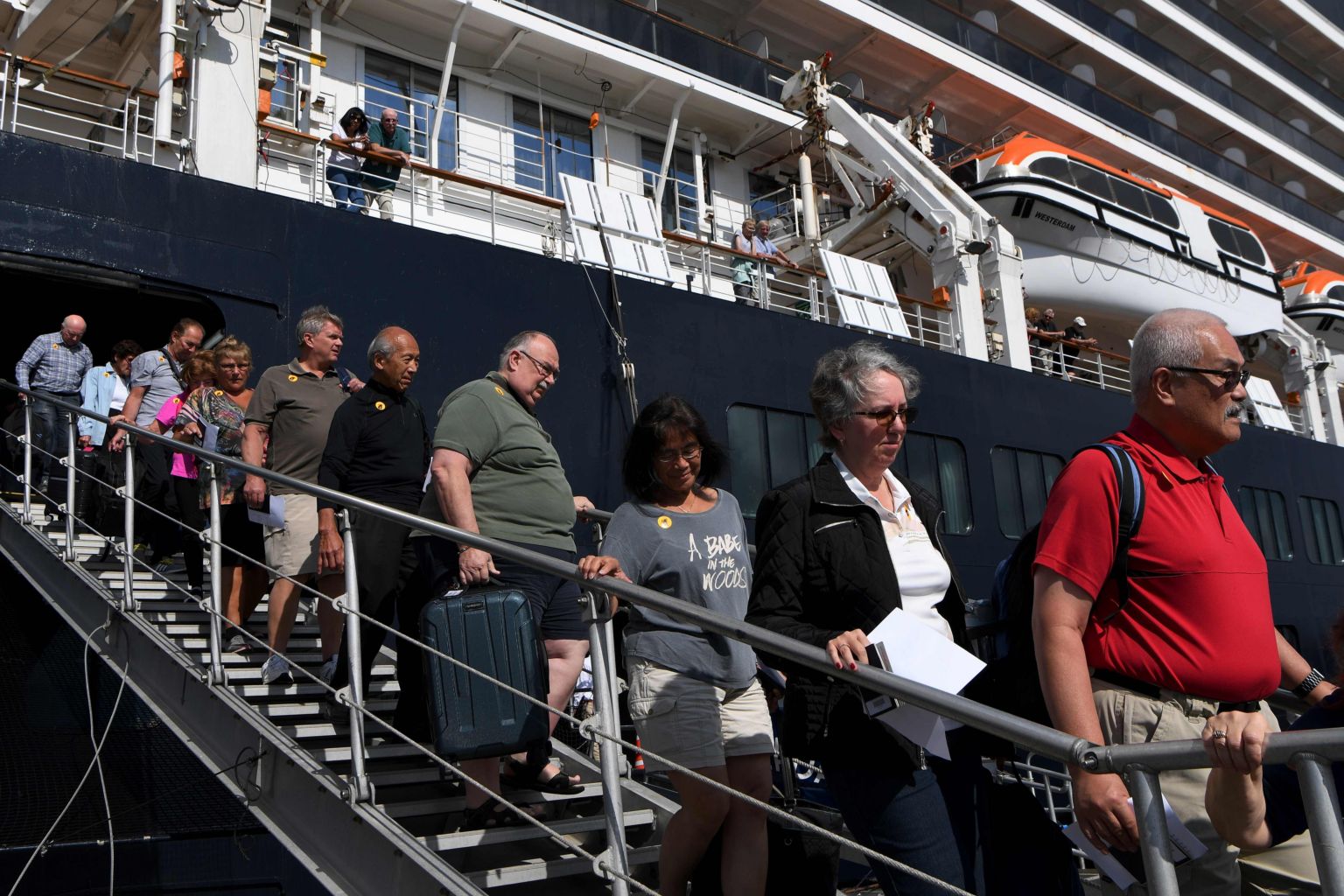 Passengers disembarking from the Westerdam cruise ship in Sihanoukville, Cambodia, on Feb 15, 2020.