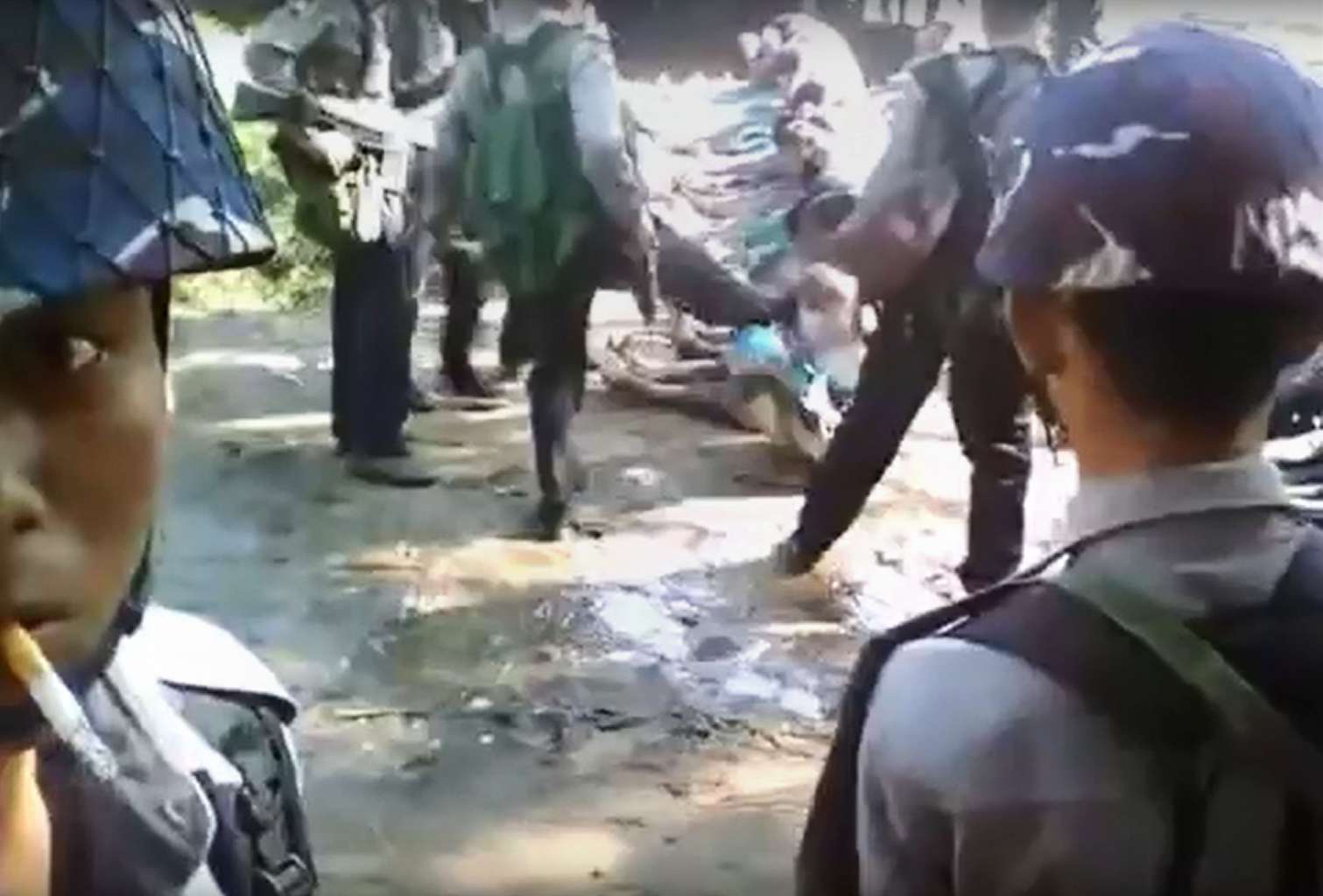 A screen grab from a YouTube video showing a policeman kicking a Rohingya minority villager in Kotankauk village during a police area clearance operation on Nov 5, 2016.