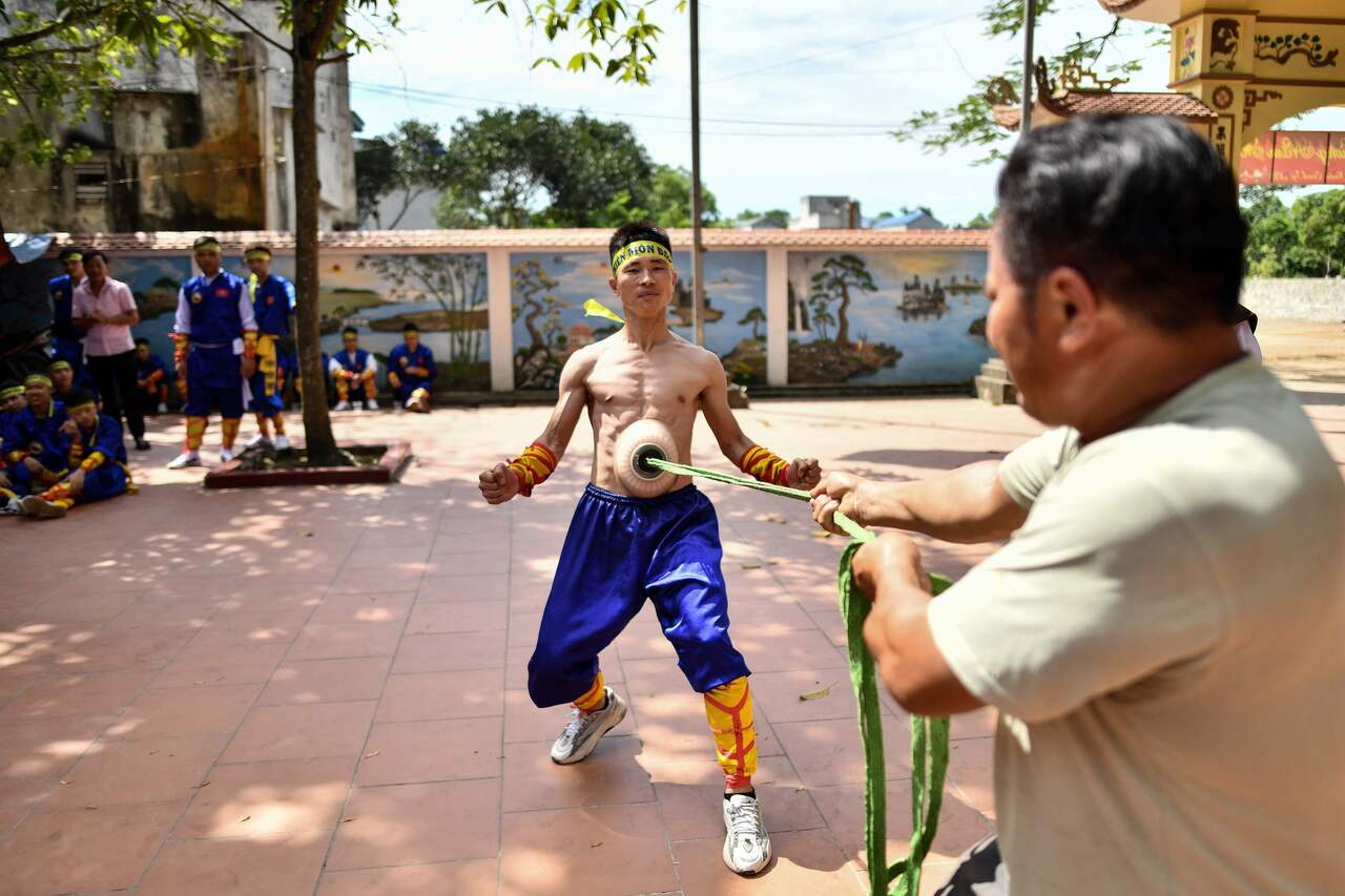 <p>This photograph taken on June 7, 2020 shows Do An Tuan, 30, student of the centuries-old martial art of Thien Mon Dao, with a pulley on his stomach being pulled by a man inside the Bach Linh temple compound at Du Xa Thuong village in Hanoi. - An increasing number of Vietnamese are finding refuge in the centuries-old martial art Thien Mon Dao, which grew out of a need to protect the country from invaders but now offers a route to mental wellbeing in the rapidly changing Communist nation. (Photo by Manan VATSYAYANA / AFP)</p>