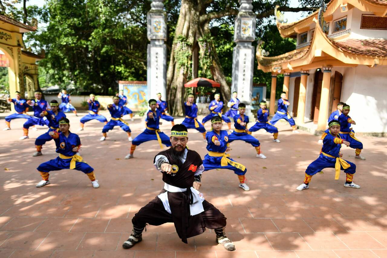 <p>This photograph taken on June 7, 2020 shows master Nguyen Khac Phan (C) teaching students during a training class for the centuries-old martial art of Thien Mon Dao inside the Bach Linh temple compound at Du Xa Thuong village in Hanoi. - An increasing number of Vietnamese are finding refuge in the centuries-old martial art Thien Mon Dao, which grew out of a need to protect the country from invaders but now offers a route to mental wellbeing in the rapidly changing Communist nation. (Photo by Manan VATSYAYANA / AFP)</p>