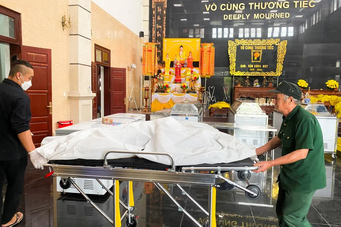 At Halong city’s main funeral home, bodies wrapped in red cloth were being carried in on stretchers, as friends and relatives cried in front of more than a dozen coffins.