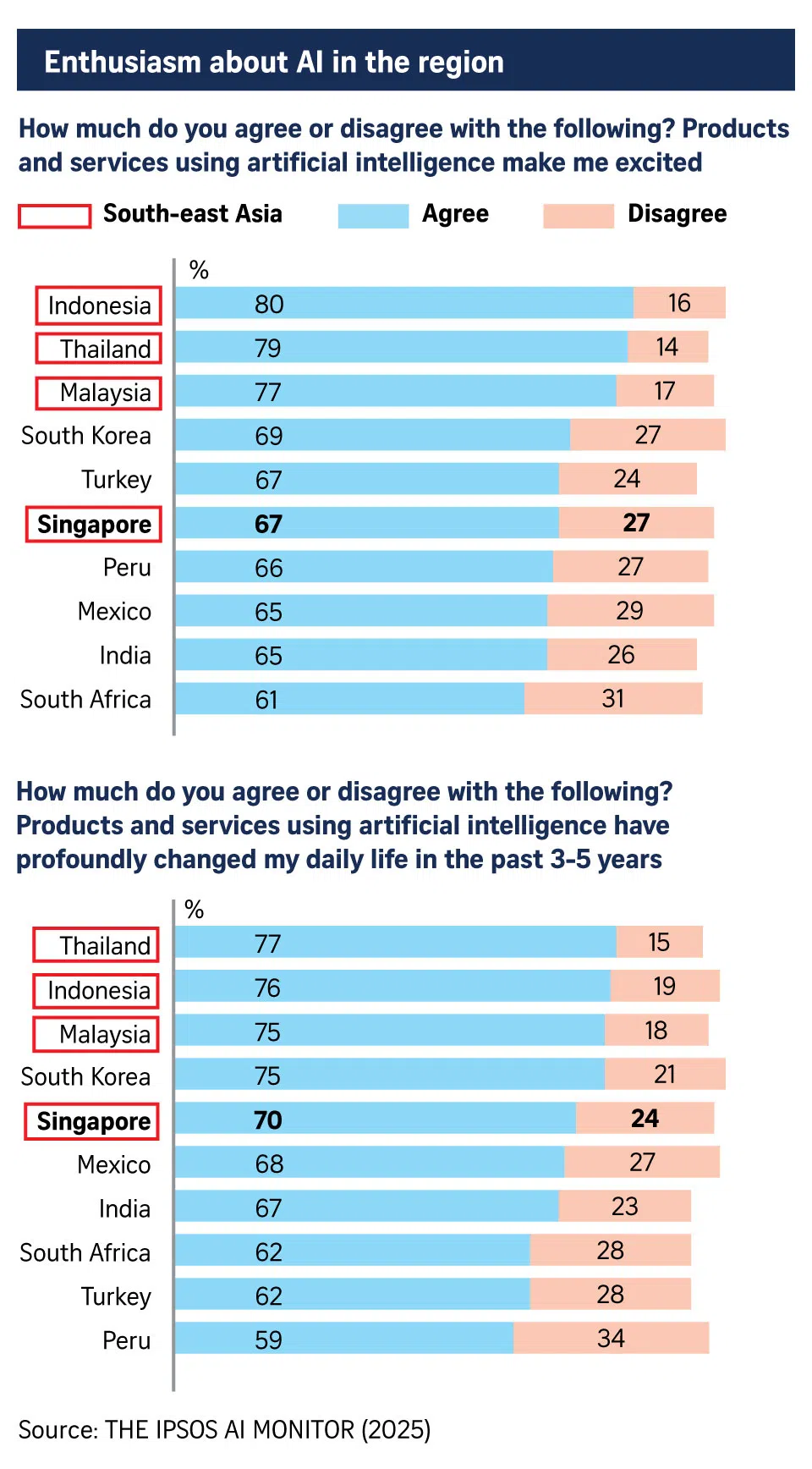 That enthusiasm is reflected in daily life. About three in four people in Indonesia, Thailand and Malaysia, and seven in 10 in Singapore, say AI has already changed how they live over the past three to five years. This compares with about half of respondents worldwide.