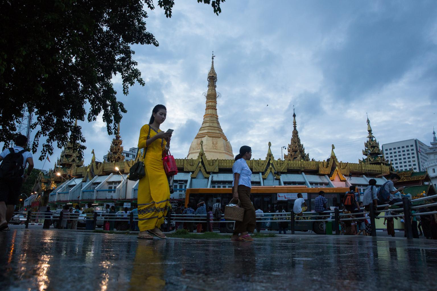 A woman uses a smartphone while walking past the Sule Pagoda stupa at Maha Bandula Park in Yangon, Myanmar.