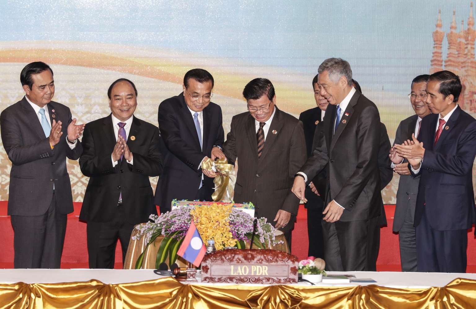 Chinese Premier Li Keqiang (third from left) participating in a cake-cutting ceremony together with Asean leaders during the Asean-China Summit in Vientiane, Laos, on Sept 7, 2016.