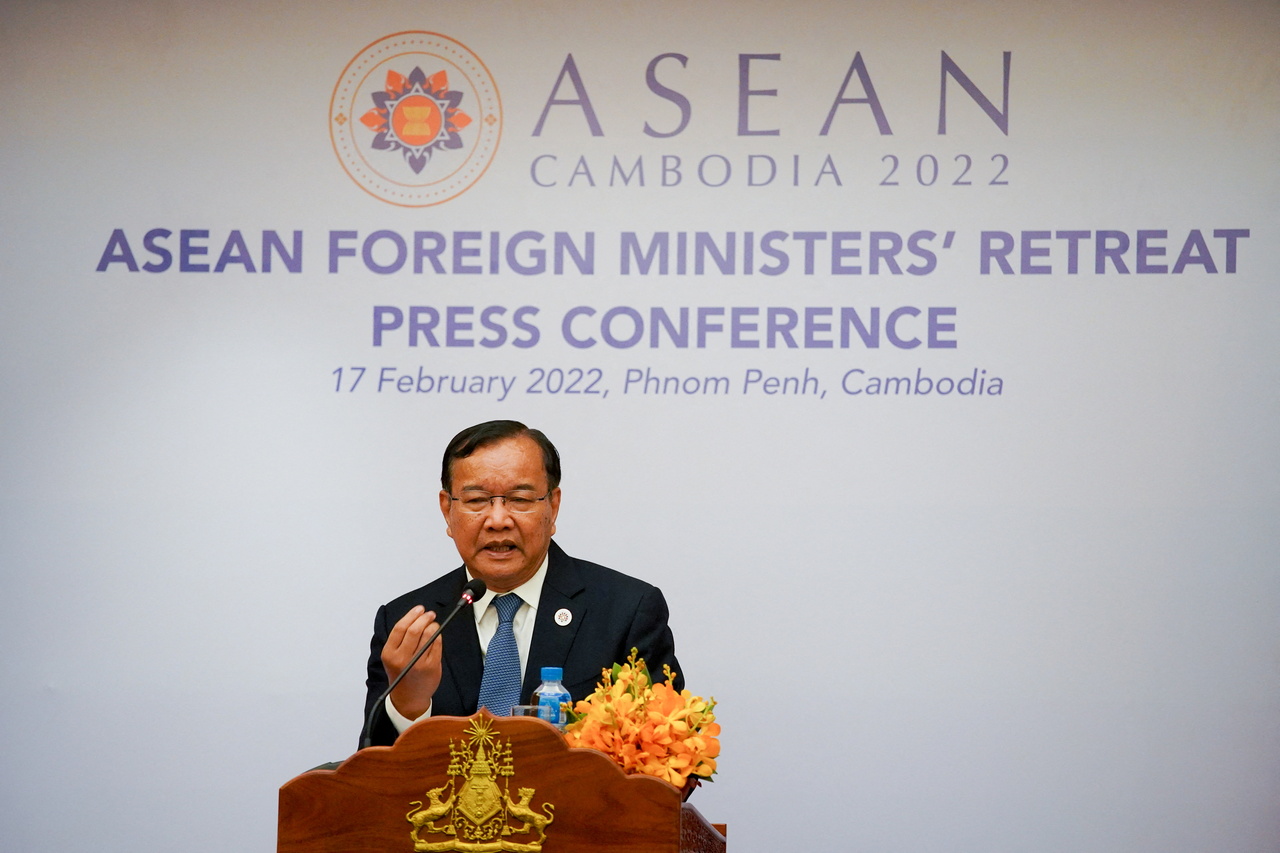Cambodia's Foreign Minister Prak Sokhonn speaking during a news conference in Phnom Penh, on Feb 17, 2022.