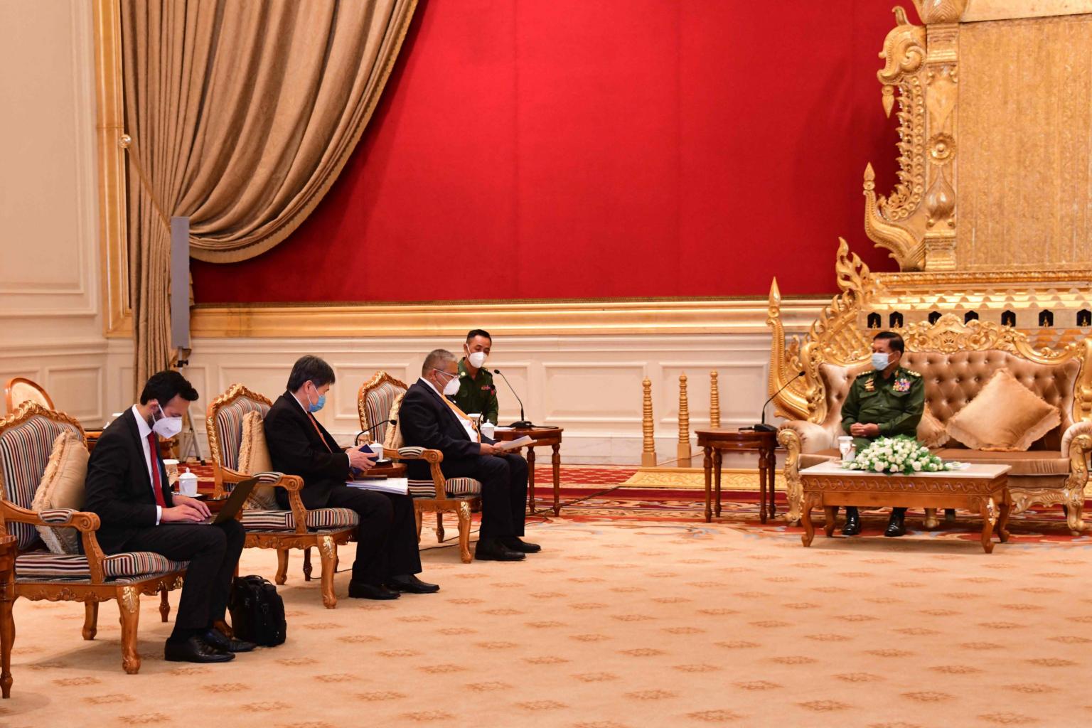 Asean Secretary-General Lim Jock Hoi (second from left) and Erywan Yusof (third from left) and Myanmar's military ruler Min Aung Hlaing during a meeting in Naypyidaw, Myanmar, on June 4, 2021.