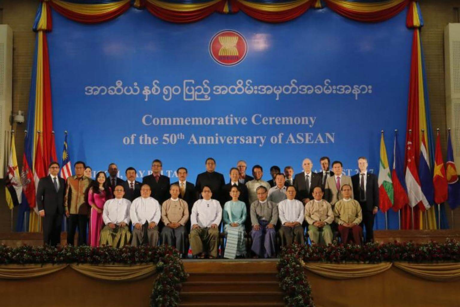 Myanmar's State Counsellor Aung San Suu Kyi (centre, front) with ASEAN delegates as well as Ambassadors to Myanmar of the USA, Japan and China pose for a family photo during the Commemorative Ceremony of 50th Anniversary of ASEAN in Naypyitaw, Myanmar on Aug 14, 2017.