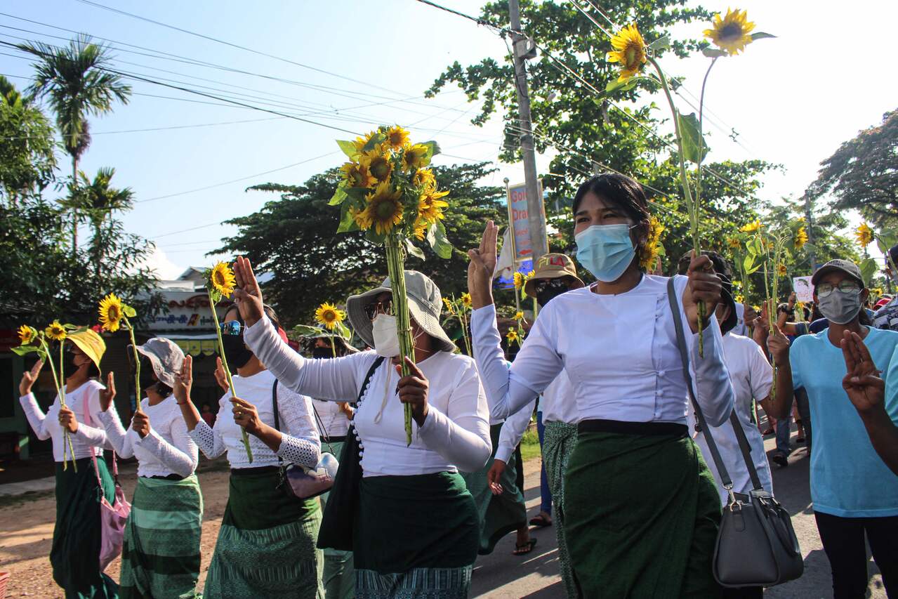 Protesters hold sunflowers during a demonstration against the military coup in Dawei, Myanmar, on April 21, 2021.