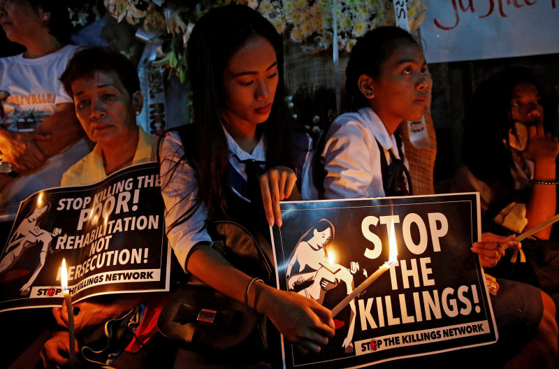 Protesters hold lighted candles and placards at the wake of student Kian Loyd delos Santos, who was among the people shot dead in a police raid connected to the war on drugs, in Metro Manila, on Aug 25, 2017.