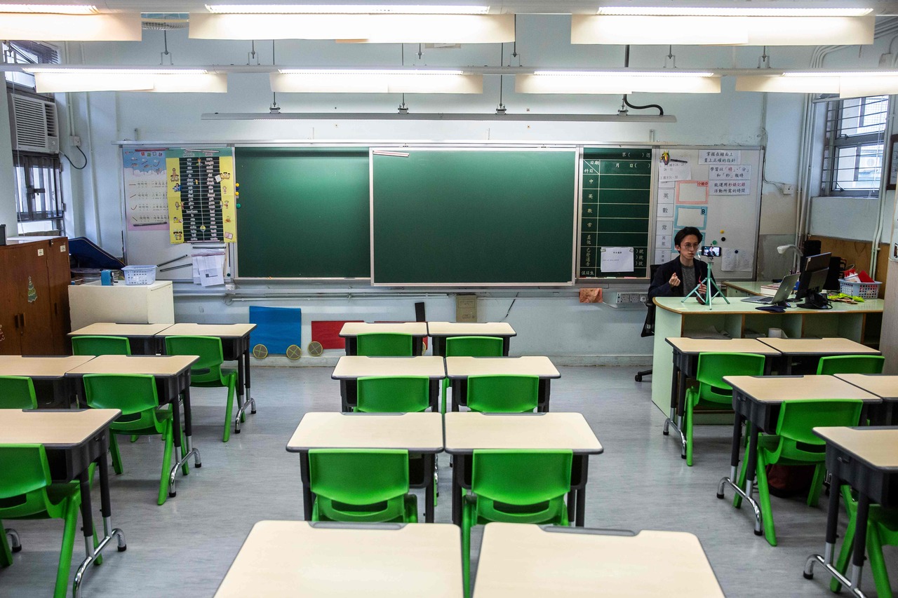 Primary school teacher Billy Yeung recording a video lesson in an empty classroom in Hong Kong on March 6, 2020, for his pupils, who have had their classes suspended due to the coronavirus outbreak.