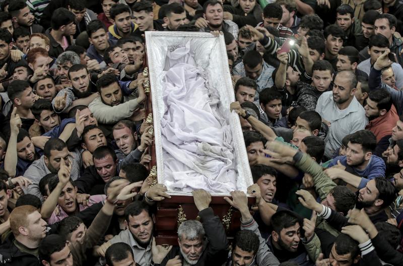 Palestinians mourners carry the body of Hamas engineer Fadi Al-Batsh during his funeral in Jabaliya, northern Gaza Strip, on April 26, 2018.