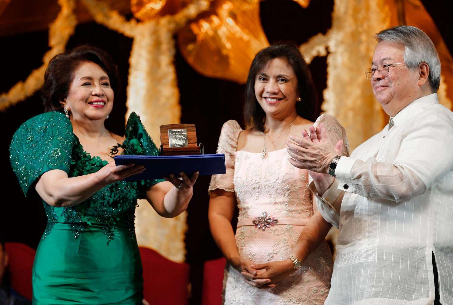 Ramon Magsaysay 2016 awardee, Conchita Carpio Morales (left) of the Philippines receives her prize from Philippine Vice President Leni Robredo (centre) during the award ceremony held in Manila, Philippines on Aug 31, 2016.