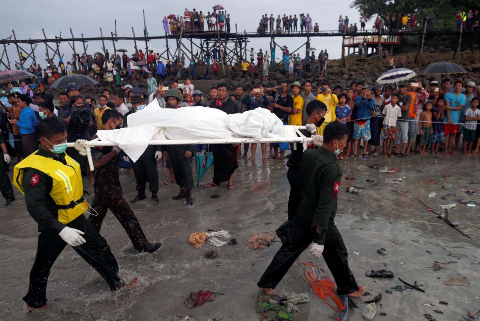 Military soldiers carry dead bodies from a crashed military plane outside Launglon township, Myanmar, on June 8, 2017.
