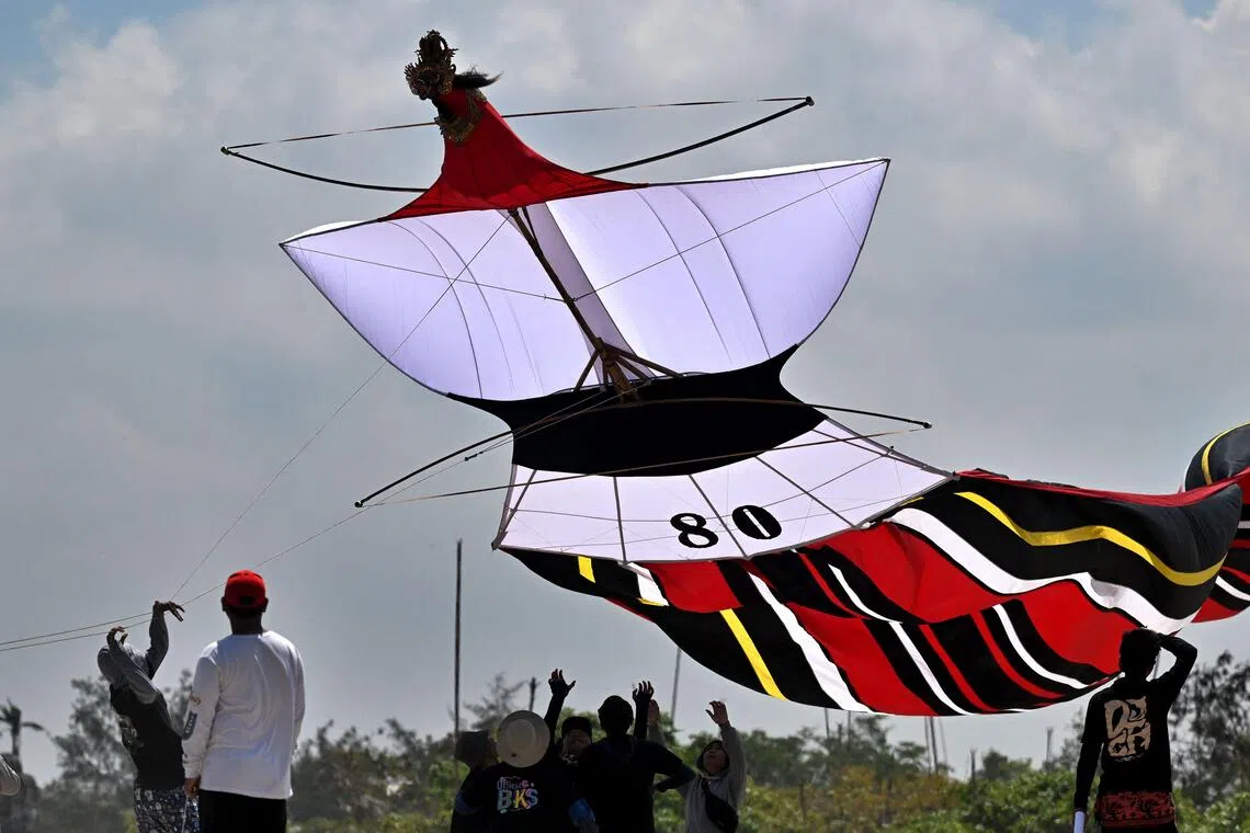 Balinese people fly a traditional kite a kite festival at Mertasari beach in Denpasar on Indonesia's resort island of Bali.