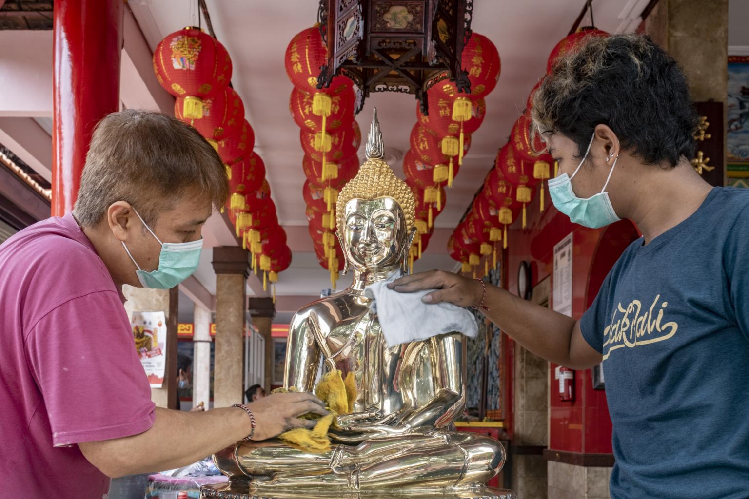 Statues are cleaned for the upcoming Chinese New Year at a temple in Kuta, Bali, on Feb 5, 2021.
