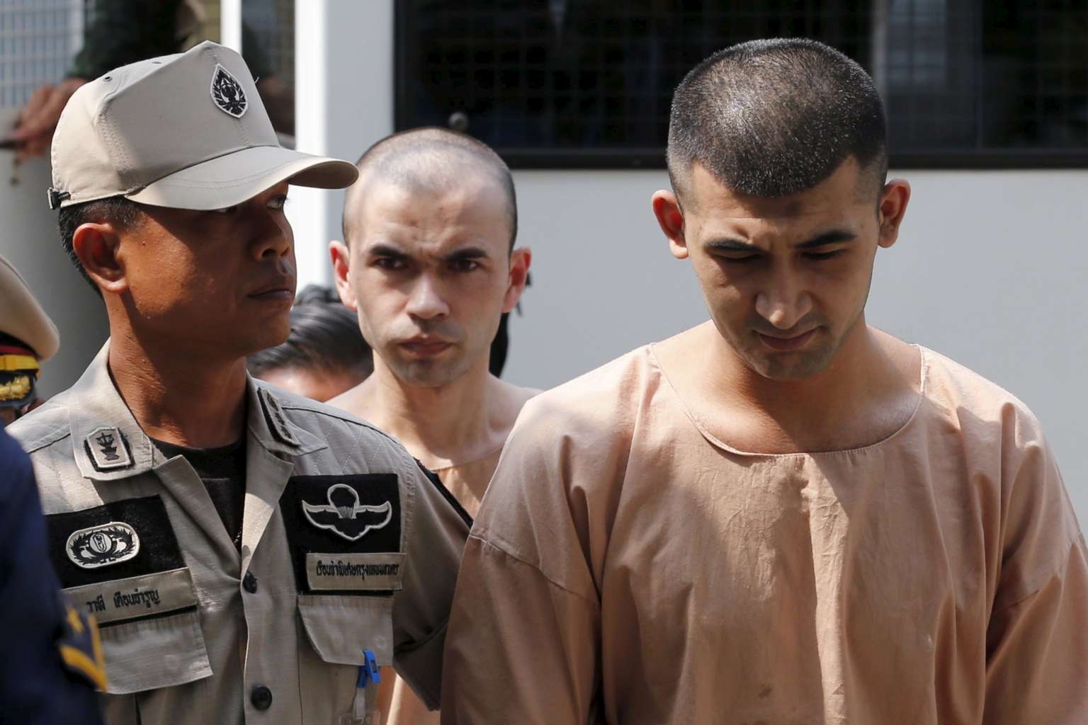 Bangkok blast suspects Adem Karadag (back) and Yusufu Mieraili arriving at the military court in Bangkok on April 20.