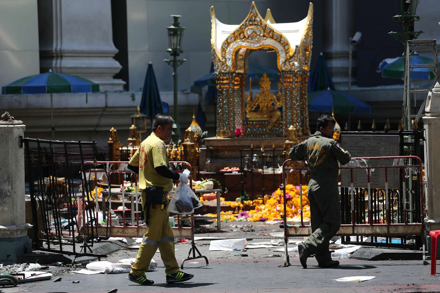 Rescue workers walk past the Erawan Hindu shrine in Bangkok, Thailand on Aug 18, 2015.