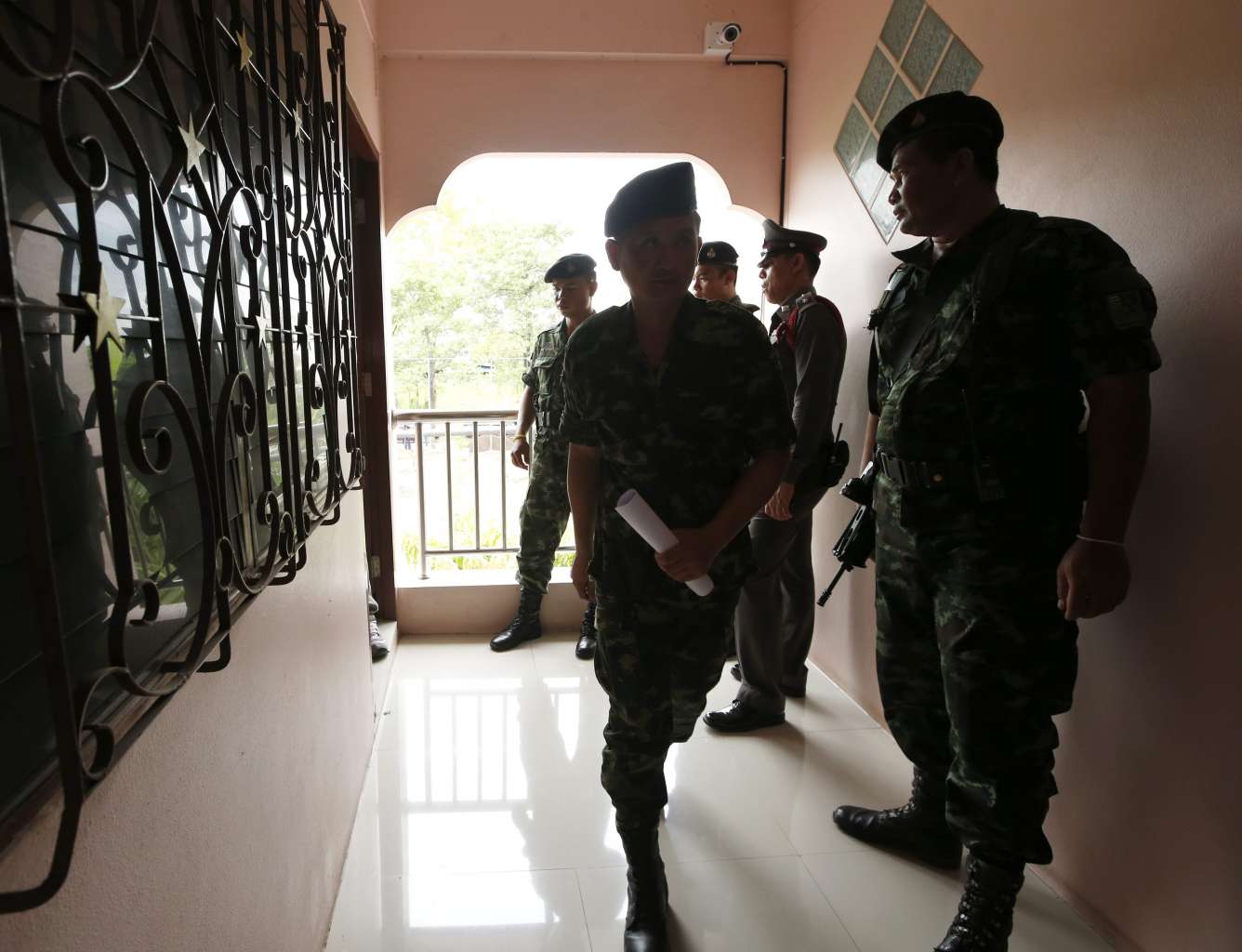 Thai soldiers and police officers examine a rented room which is believed to be linked with the arrested foreign suspect during a joint force military and police searching operation at Mimuna Garden Home apartment in Minburi district, Thailand on Aug 30, 2015.