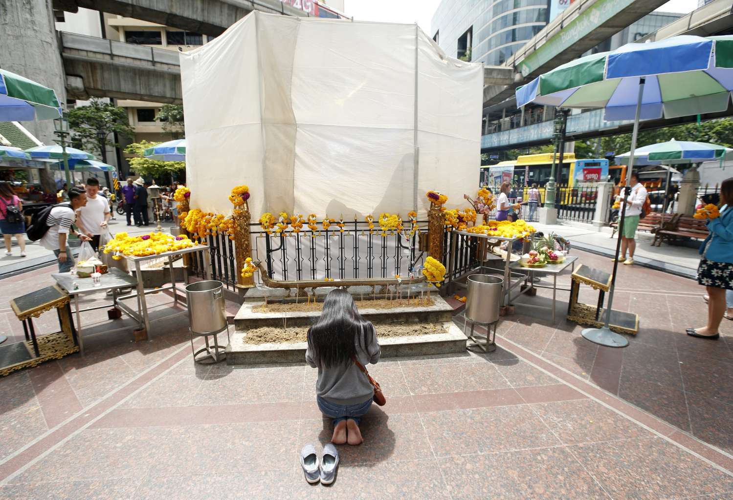 A woman prays before the Erawan shrine, covered for renovation and repair after the Aug 17 bomb blast, in Bangkok on Sept 1, 2015.