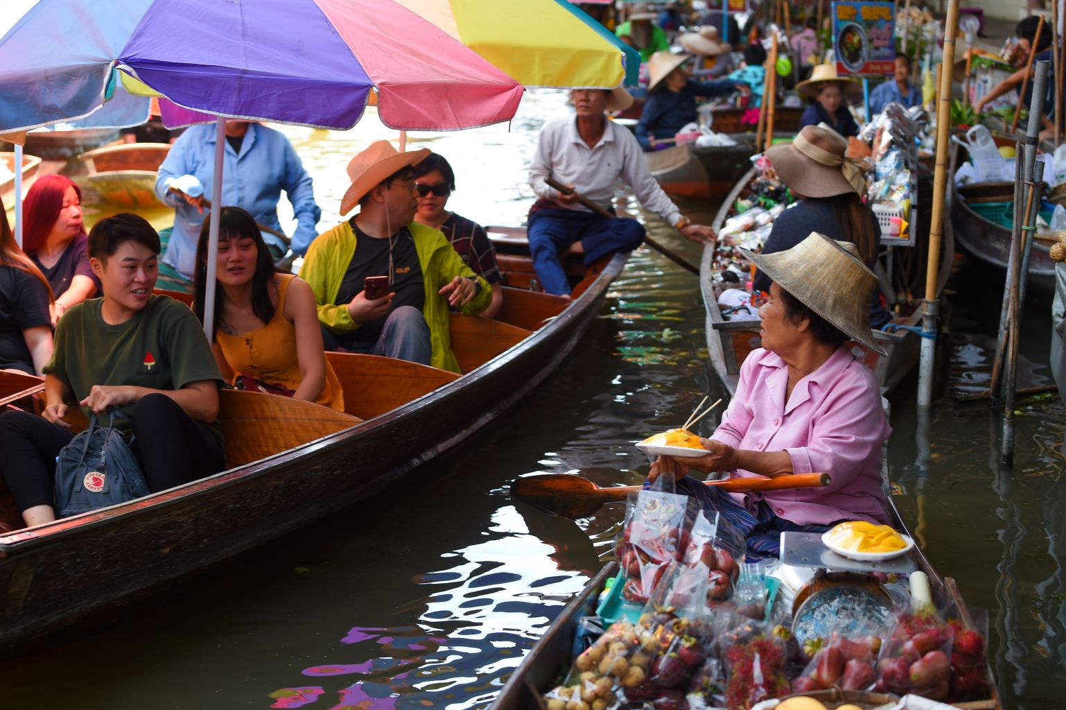 A vendor offers mangoes to tourists riding on a boat at Damnoen Saduak floating market in Bangkok.