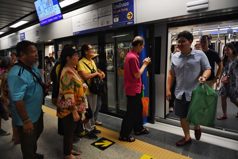 Thai Transport Minister Saksayam Chidchob attended the launching ceremony of the first train running between Hua Lamphong and Tha Phra held on Monday morning. He told media that passengers can enjoy free rides until Sept 28.