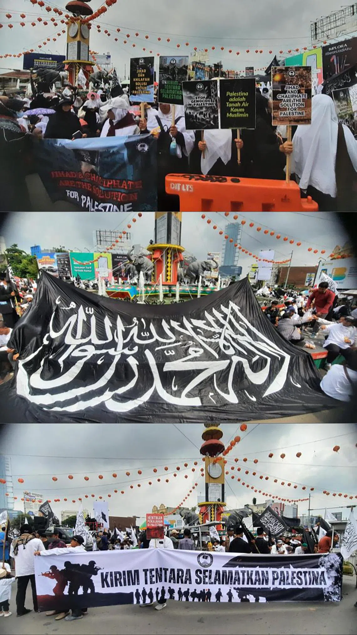 During the march, more than 17,000 former members of the defunct Hizbut Tahrir Indonesia (HTI) waved banners and chanted in Bahasa Indonesia: “Long live the caliphate! Support the caliphate!” Riding on public anger over the Gaza war, they also waved Palestinian flags.