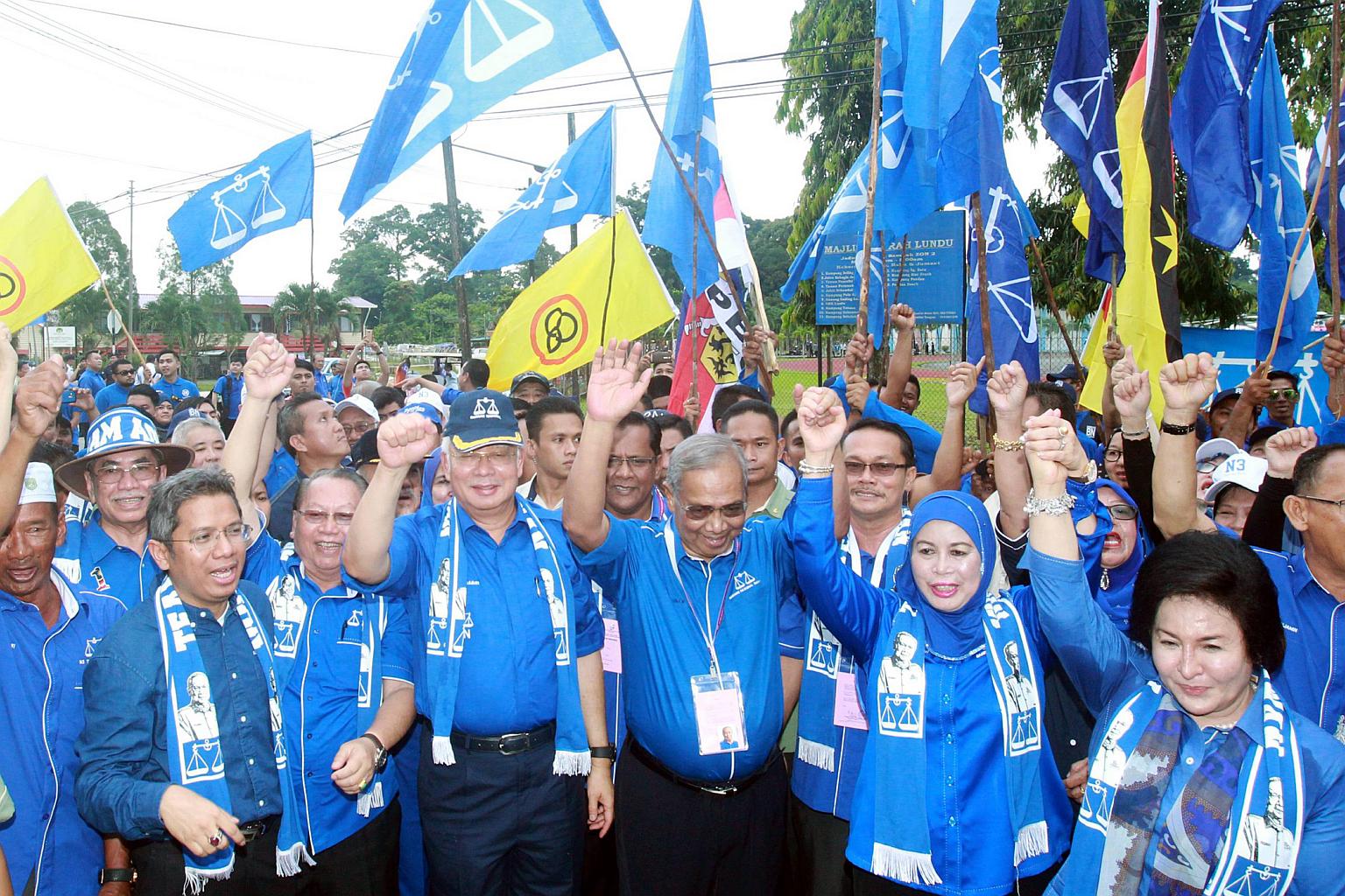 Sarawak Chief Minister Tan Sri Adenan Satem (centre right) is accompanied by Prime Minister Datuk Seri Mohd Najib Tun Razak (centre left) to the nomination centre at Dewan Masyarakat Lundu in Lundu, Sarawak.