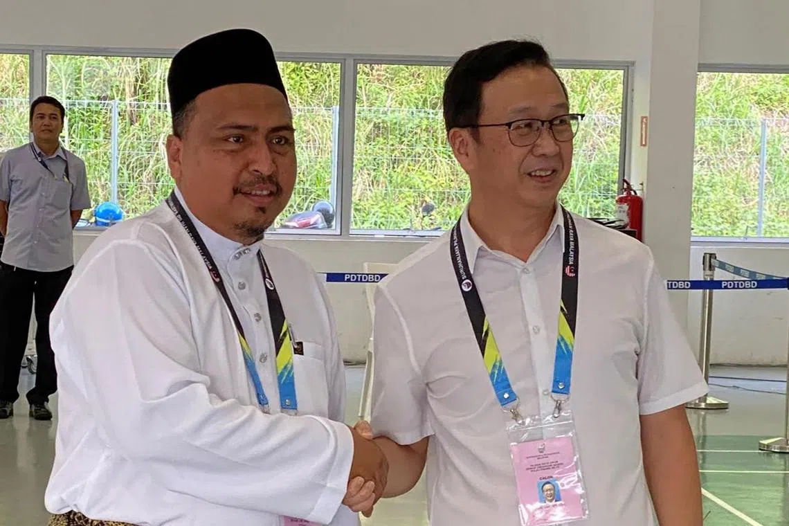 PH’s Mr Azrul Mahathir Aziz and PN’s Datuk Dominic Lau Hoe Chai shaking hands after being named the candidates for the Bayan Lepas state seat in Penang.