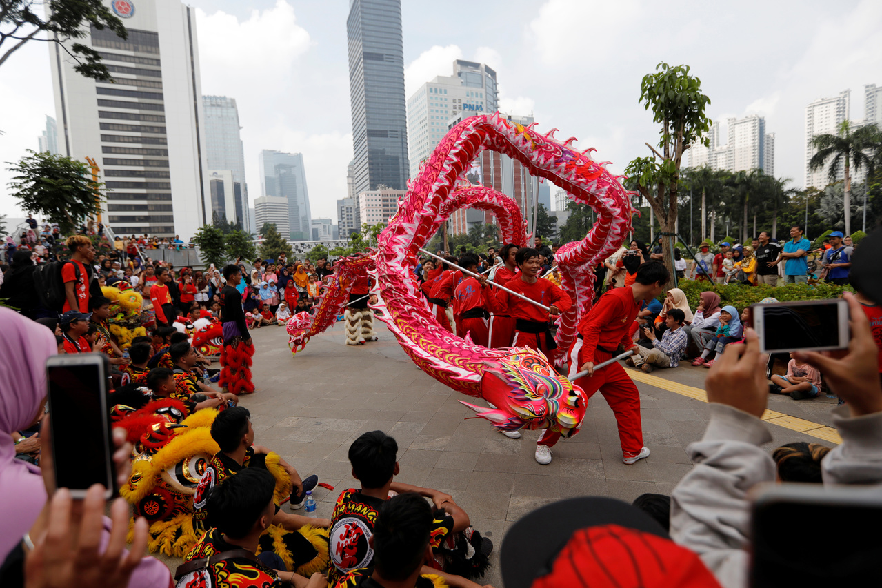 Youth performing a dragon dance at a sidewalk as part of Chinese New Year celebrations in Jakarta, Indonesia, on Jan 26, 2020.