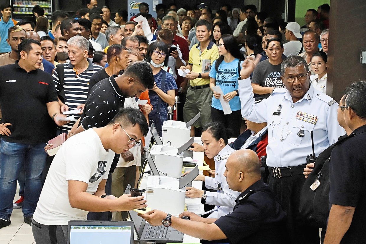 Motorists stand in line to verify outstanding traffic summonses with police officers in Penang, Malaysia on Oct 4, 2019.