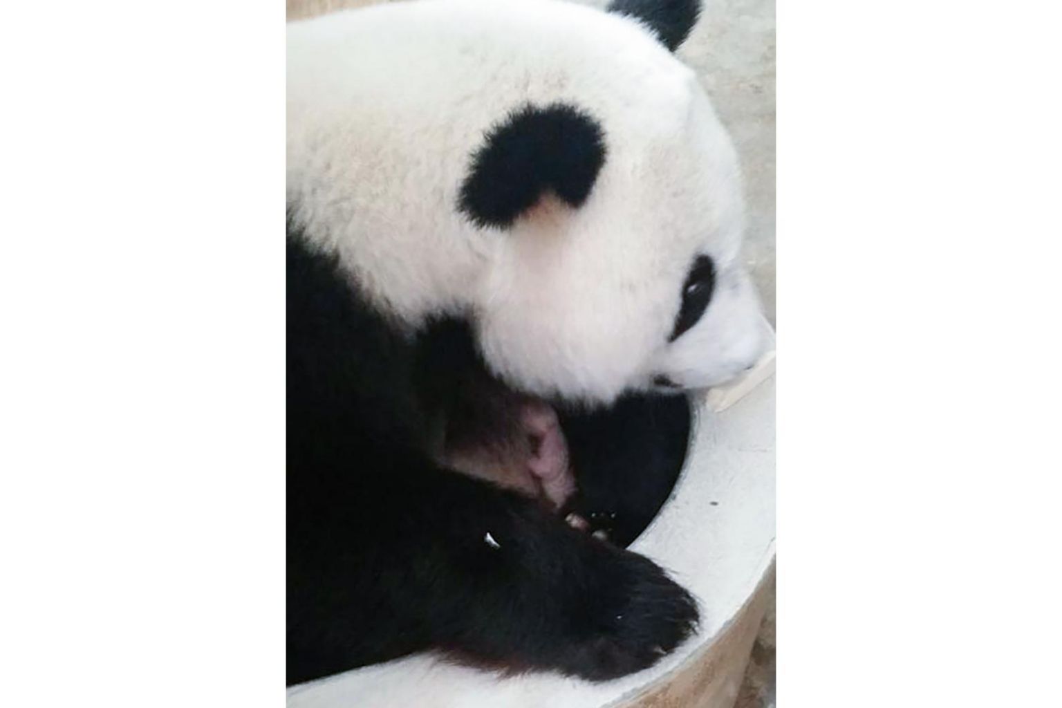 Liang Liang, a female giant panda on loan from China cuddling her cub inside her enclosure at Zoo Negara Malaysia in Kuala Lumpur.
