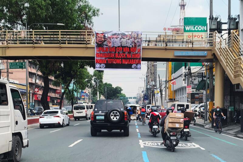 An anti-communist banner on an overhead footbridge in Manila.