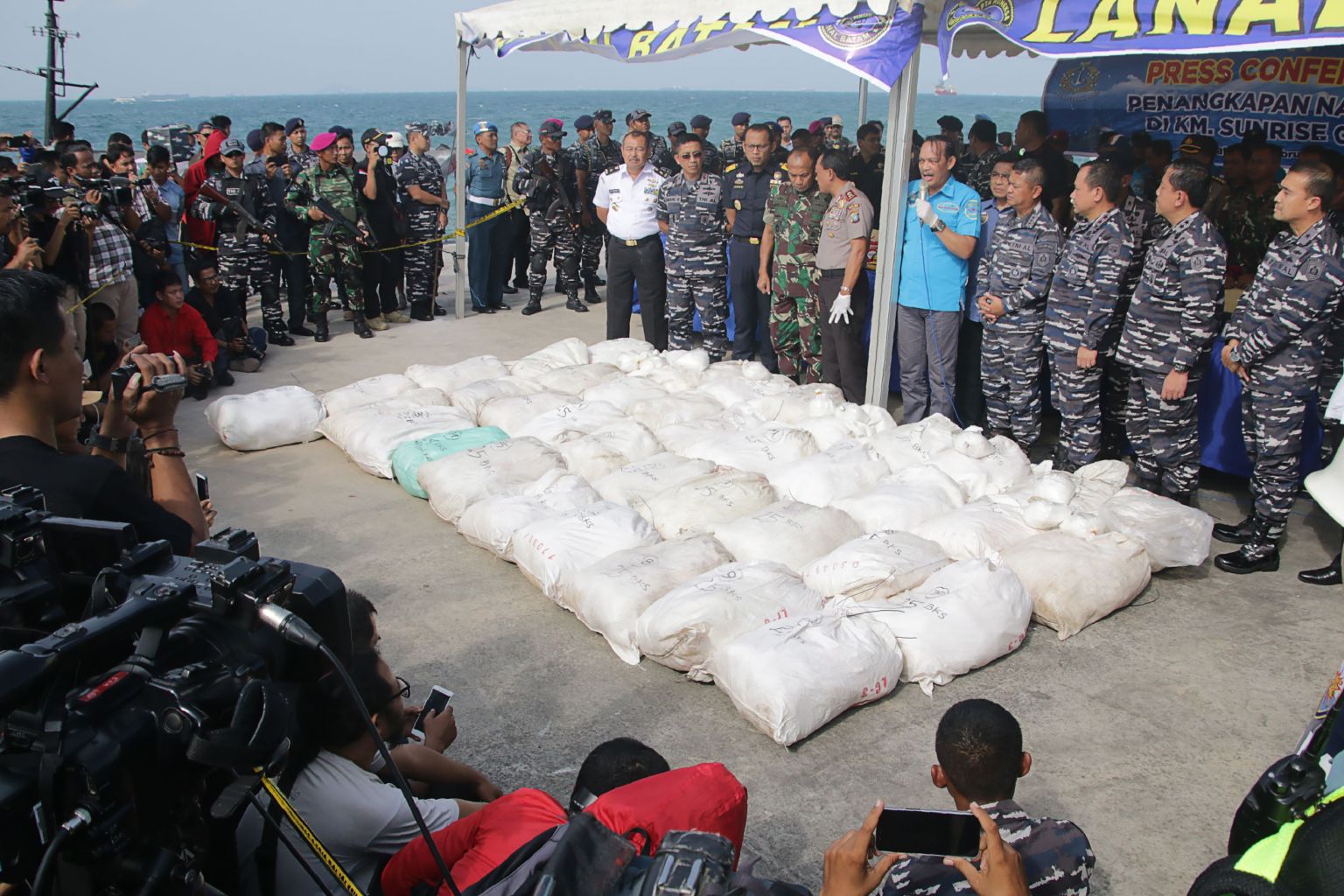 Indonesian officials displaying more than a tonne of methamphetamine that was seized from the fishing vessel "Sunrise Glory" off Batam, on Feb 10, 2018.
