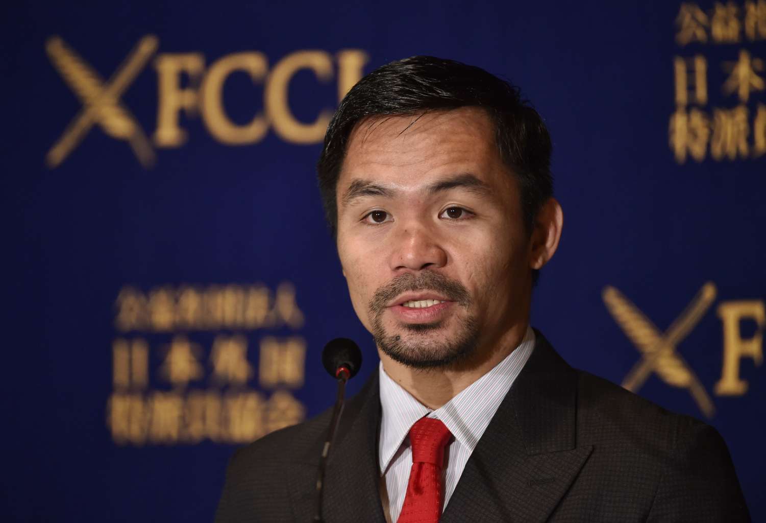 Manny Pacquiao delivers a speech during a press conference at the Foreign Correspondents' Club of Japan on Nov 26, 2016.