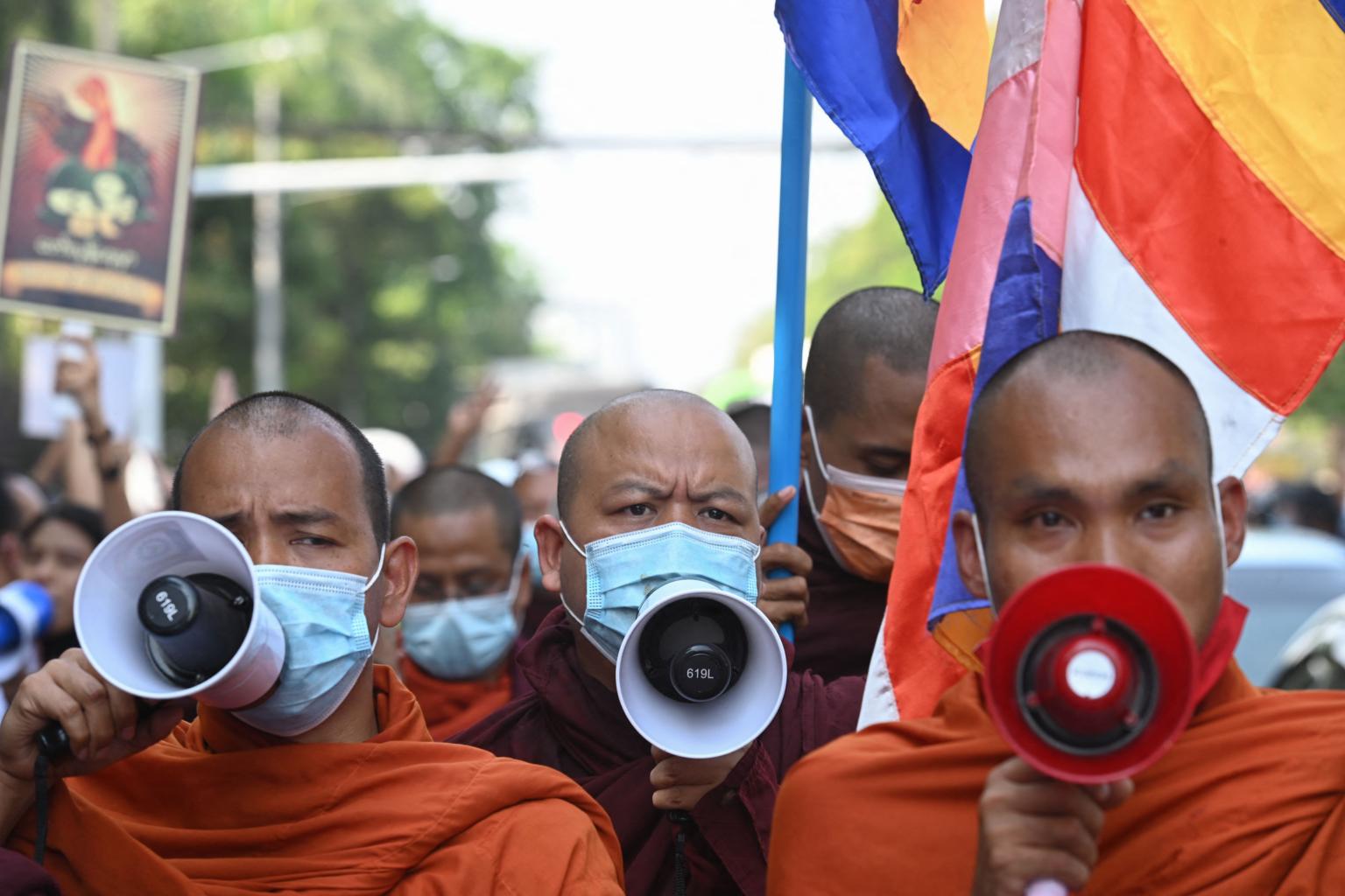 Monks were among a group that used slingshots to injure anti-coup protesters who went to Yangon's Bingalar Monastery on Feb 18 in pursuit of men dressed in robes who had earlier beaten up a demonstrator. The mob also used large sticks to smash cars blocking traffic nearby.
