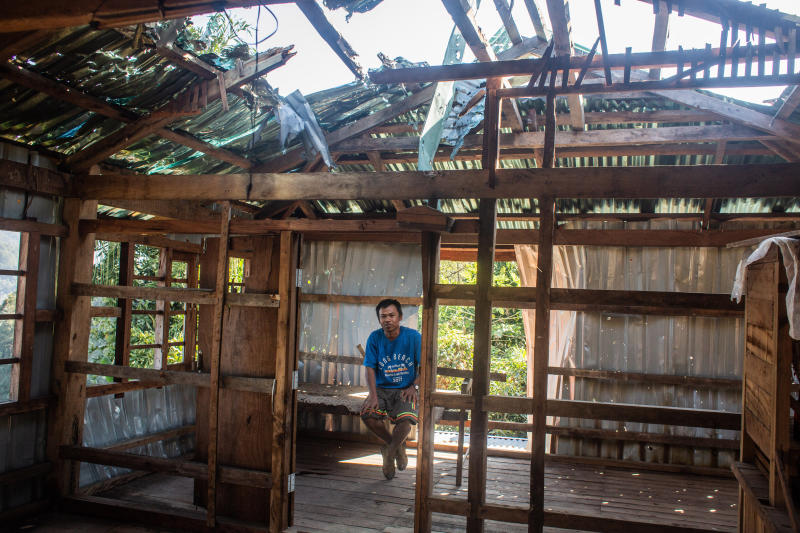 Mr Aik Min sits in the remains of his house that was destroyed after clashes between the Myanmar military and Ta’ang National Liberation Army.