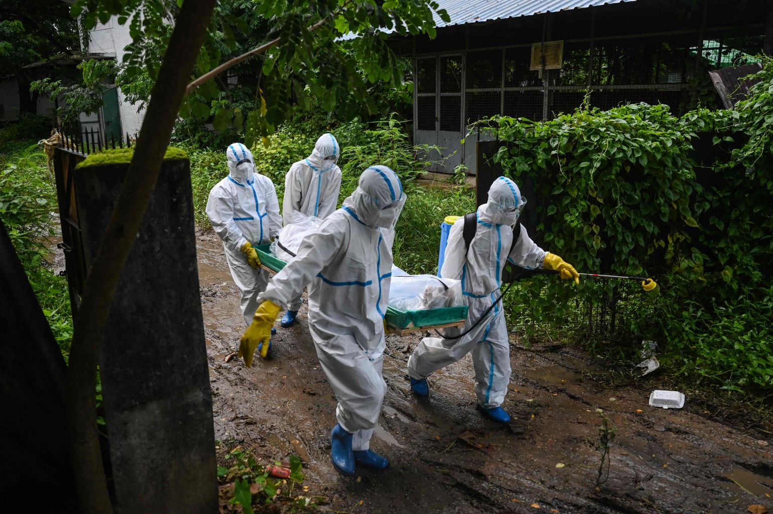 Volunteers wearing personal protective equipment carry the body of a Covid-19 victim to a cemetery in Hlegu Township in Yangon, on July 10, 2021.