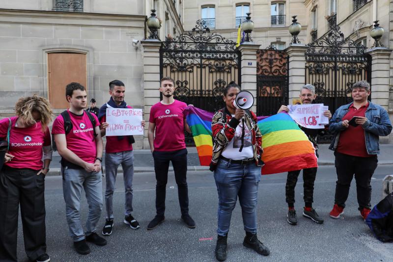 Gay activists shout slogans as they stage a protest in front of the Brunei embassy in Paris over the sultanate's new death penalty laws for gay sex and adultery, on April 18, 2019.