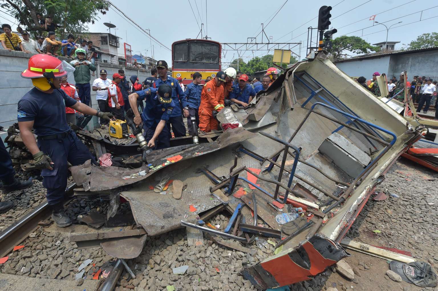 Indonesian firefighters cut the wreckage of a minibus after it collided with a train in Jakarta on Dec 6, 2015.