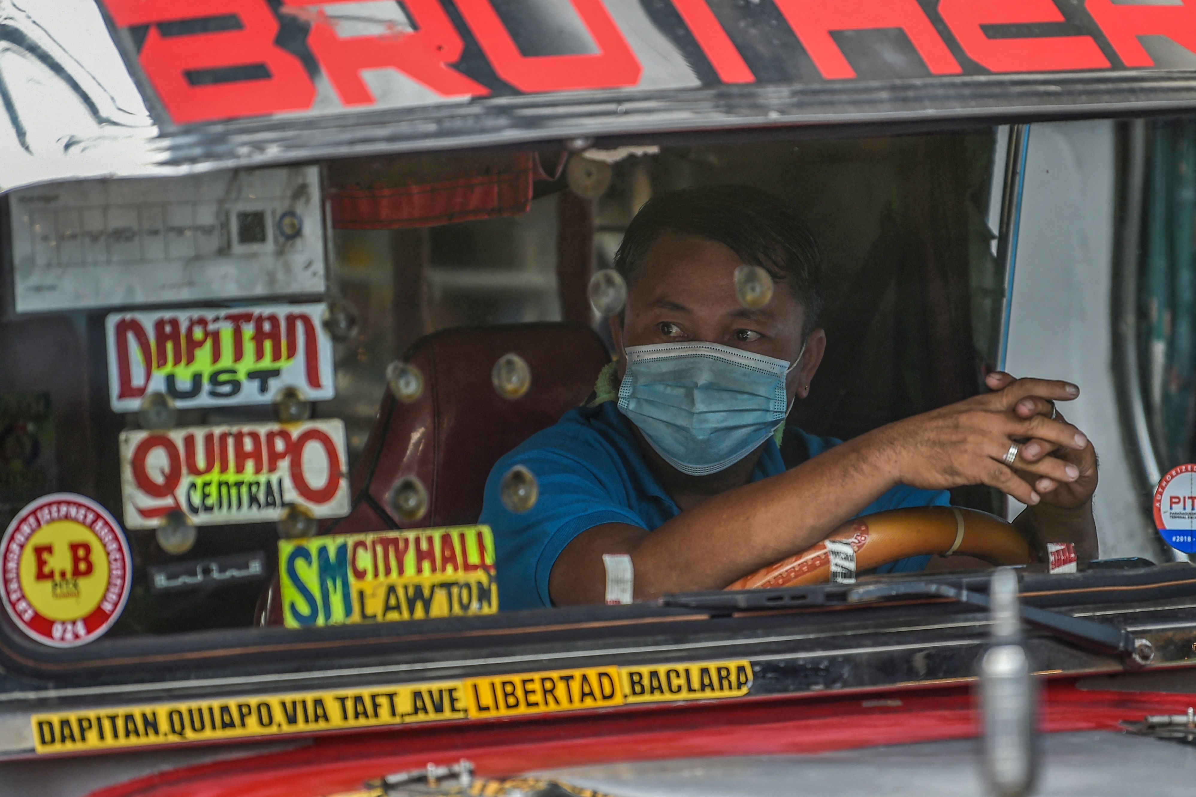 A jeepney driver wearing a face mask to protect himself against the Covid-19 coronavirus drives along a street in Manila on Sept 7, 2021.