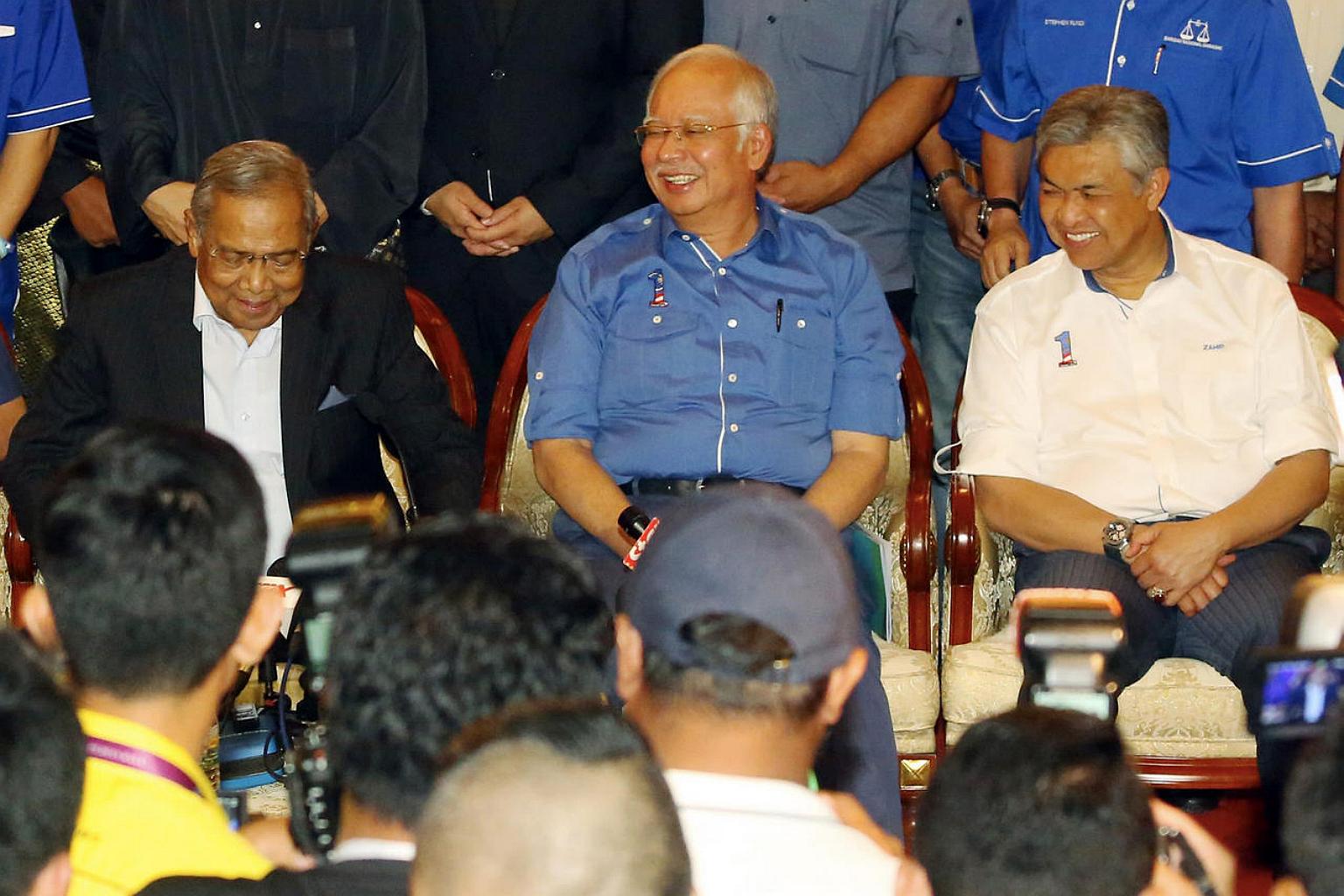 Malaysian Prime Minister Najib Razak (centre) with Sarawak Chief Minister Adenan Satem (left) and Deputy Prime Minister Ahmad Zahid Hamidi at the press conference after the Sarawak state election results were announced on May 7, 2016.