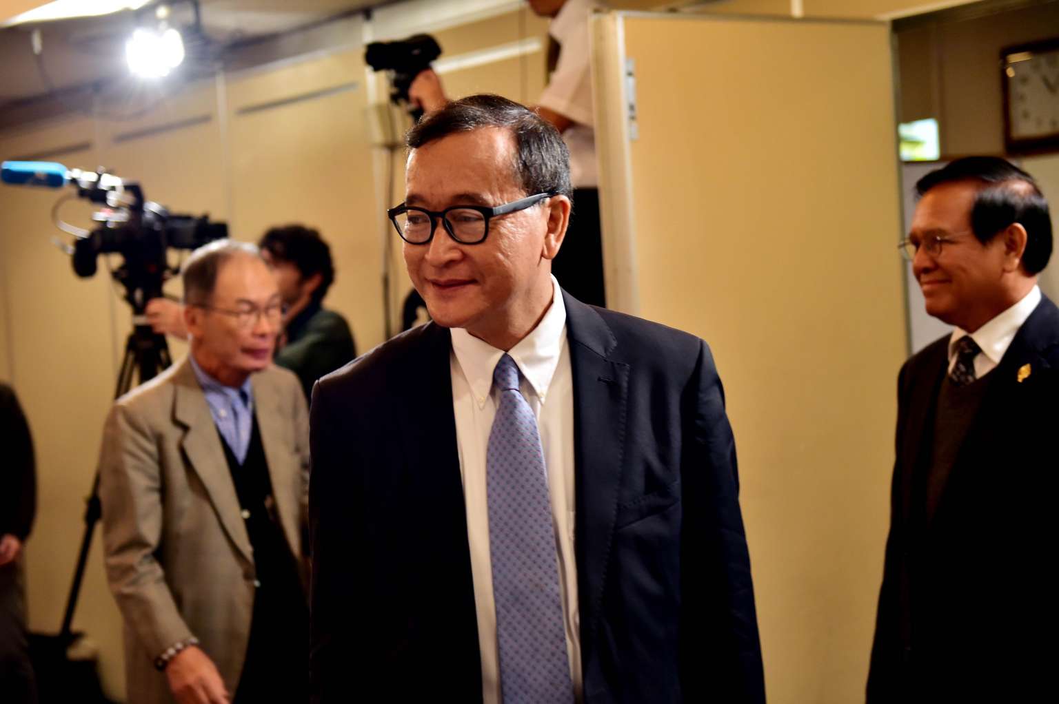 Cambodia's main opposition Cambodia National Rescue Party president Sam Rainsy arrives at a conference room.