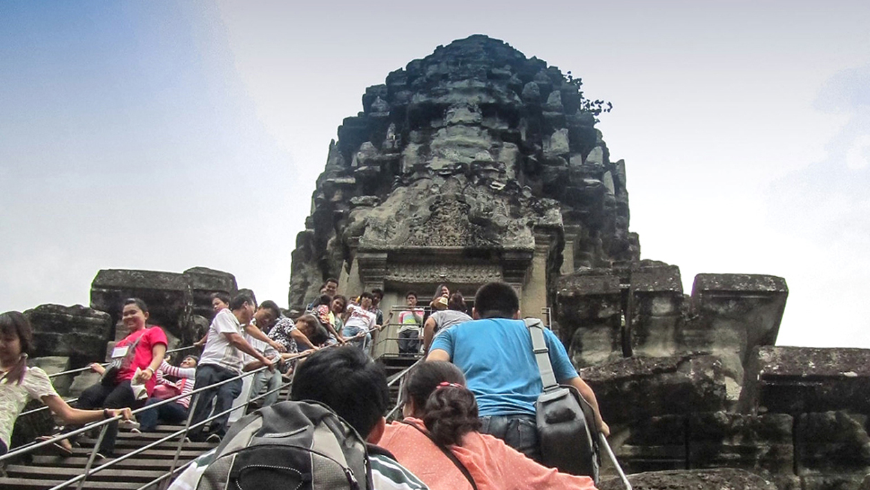 Visitors climb the stairs to get to the 12th century Angkor Wat temple in Siem Reap, Cambodia.