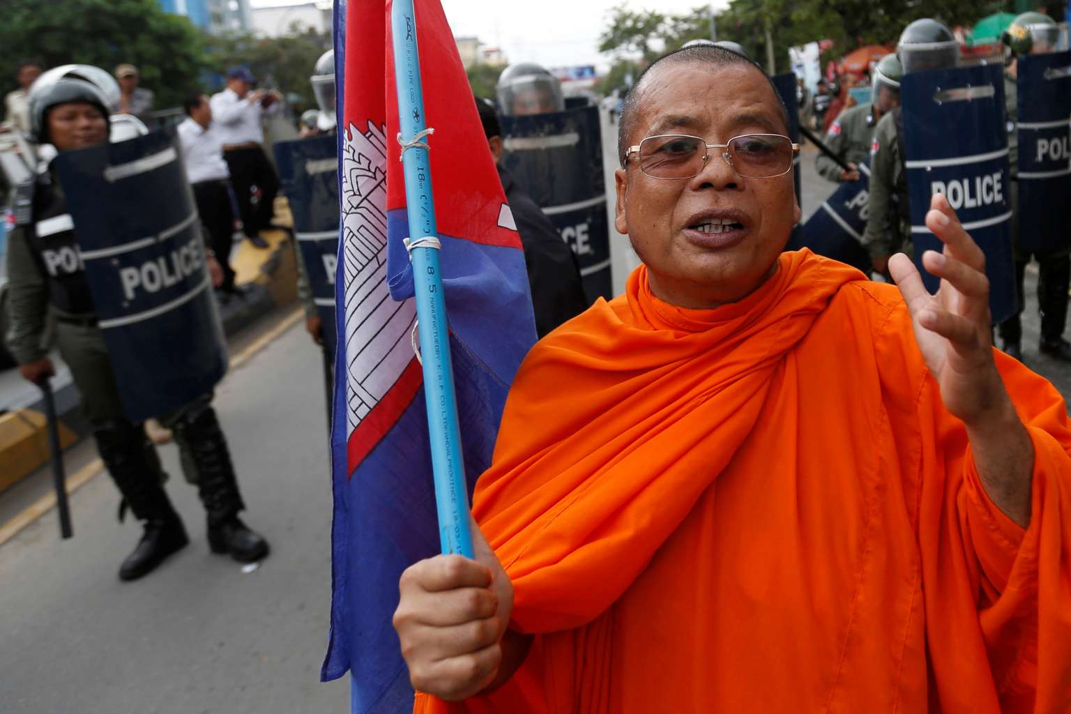 A supporter of opposition CNRP in a march to deliver petition to the Parliament and King Norodom Sihamoni to intervene in the country's political crisis in Phnom Penh, on May 30, 2016.