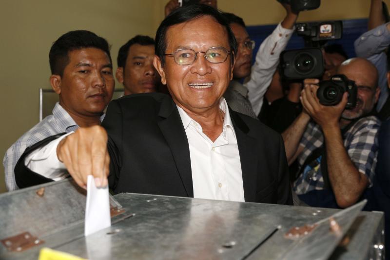 A file photo taken on June 4, 2017, shows Cambodia opposition leader Kem Sokha casting his ballot at a polling station in Phnom Penh during the local elections.